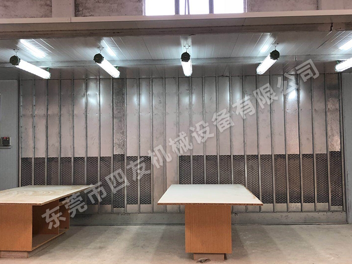 噴漆時,外部空氣經過初級過濾網過濾后由風機送到房頂,再經過頂部過濾網二次過濾凈化后進入房內。房內空氣選用全降式,以0.2-0.3m/s的速度向下流動,使噴漆后的漆霧微粒不能在空氣中逗留,而直接經過底部出風口被排出房外。這樣不斷地循環轉換,使噴漆時房內空氣清潔度達98%以上,且送入的空氣具有一定的壓力,可在車的四周構成一恒定的氣流以去除過量的油漆,從而zui大極限地確保噴漆的質量。家具出產中廣泛選用噴涂工藝對家具進行涂飾,選用噴涂工藝出產效率高,所構成的漆膜均勻細膩、平坦光滑、附著力高。但在噴涂施工時被高壓空氣所霧化的涂料,構成了大量的漆霧。漆霧是由涂料微粒和溶劑組成,漆霧比重很小,漂浮在空氣中。漆霧沉降在工件表面會影響工件的質量,操作人員吸入漆霧也危害身體健康。